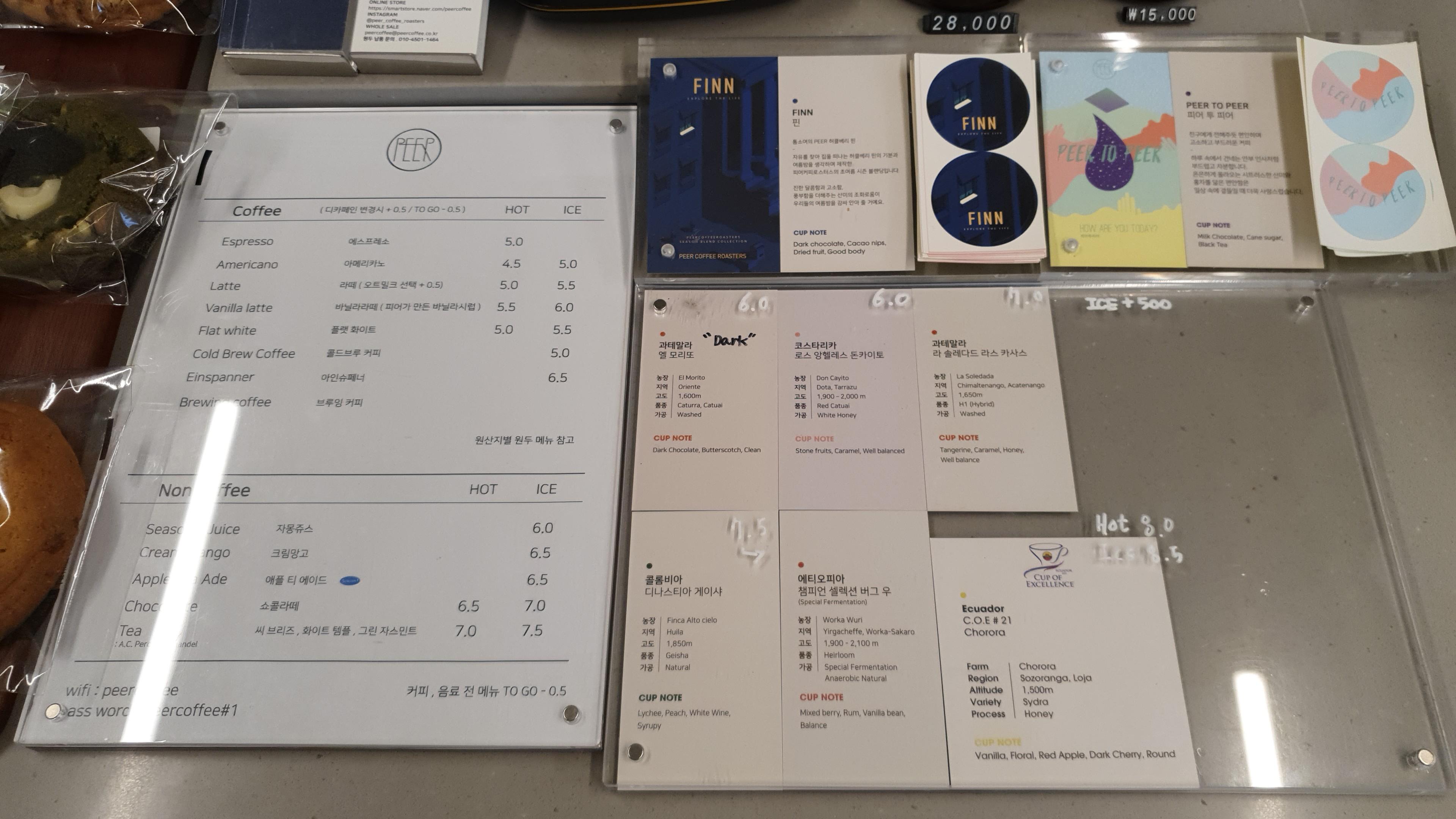 대부분 브루잉 카페들이 시즌별로 블렌딩 원두들을 선보입니다. 피어커피는 다른 로스터리드레 비해 상대적으로 좋은(비싼) 원두들을 블렌딩에 사용하는 경우가 많습니다. 방문하신다면 시즌별 블렌딩 원두를 잘 살펴보시고 괜찮다면 블렌딩 원두를 이용한 메뉴를 드셔보시는 것을 추천드립니다.