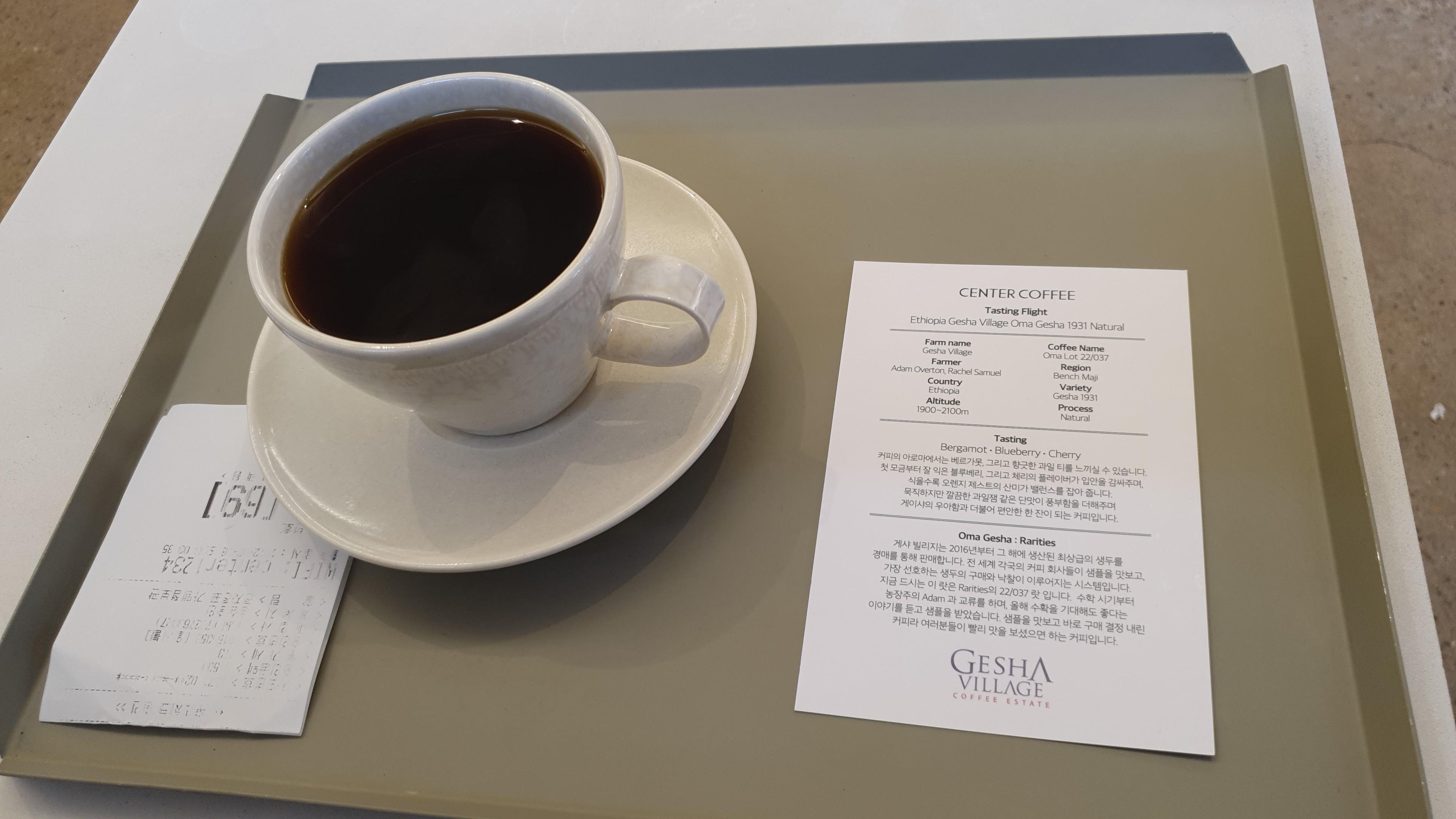 에티오피아 게샤 빌리지 오마 게샤 1931 내추럴을 하리오 V60과 센터푸어 레시피를 이용해 브루잉한 커피를 마셨습니다. 블루베리와 같은 베리류의 과실향이 가득차있으면서도, 산미가 튀지 않고, 오히려 단맛이 가득한 커피였습니다.